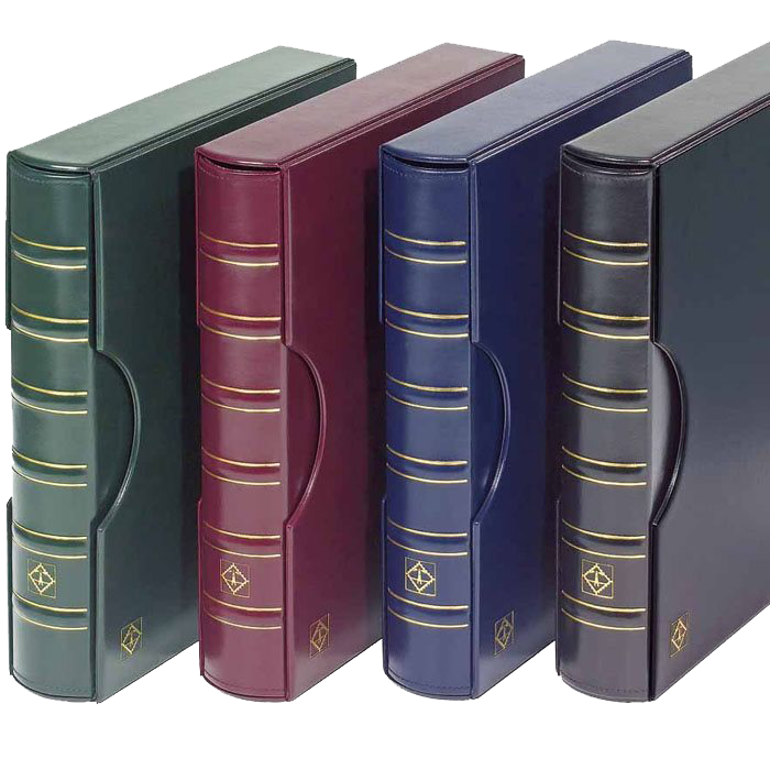 Keeping to one of the common philatelic page sizes (240mm x 282mm; 9.4" x 11.1") opens up several binder choices. I have 16x identical red 22-ring binders in slipcases housing my 1858 to 1991 collection - Russian Empire to end USSR). However, another excellent quality binder is the very smart looking Lighthouse (Leuchtturm) Grande Classic binder (shown below in 4 colours) - these are available in 3-ring and 4-ring types primarily to target the Euopean and North American markets.